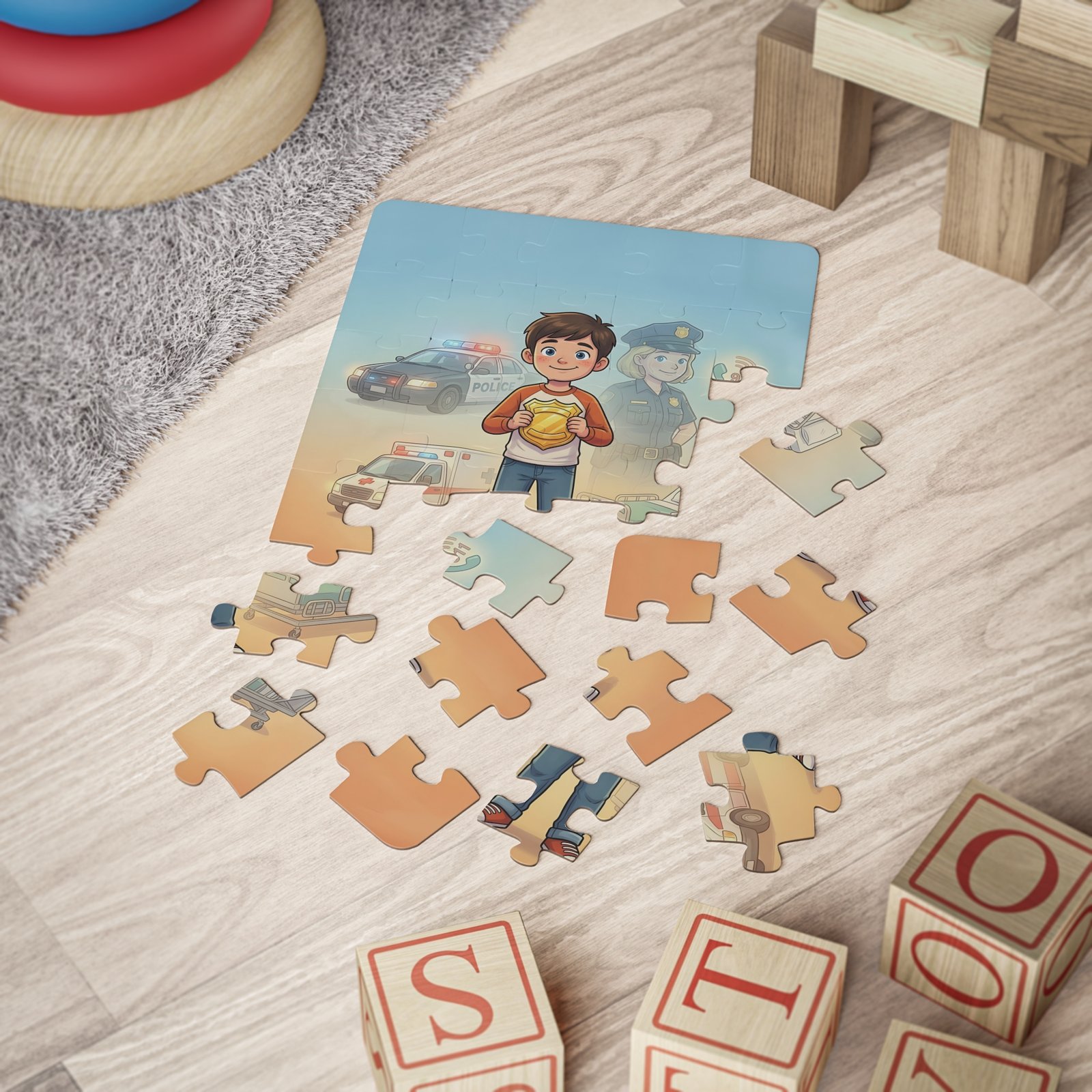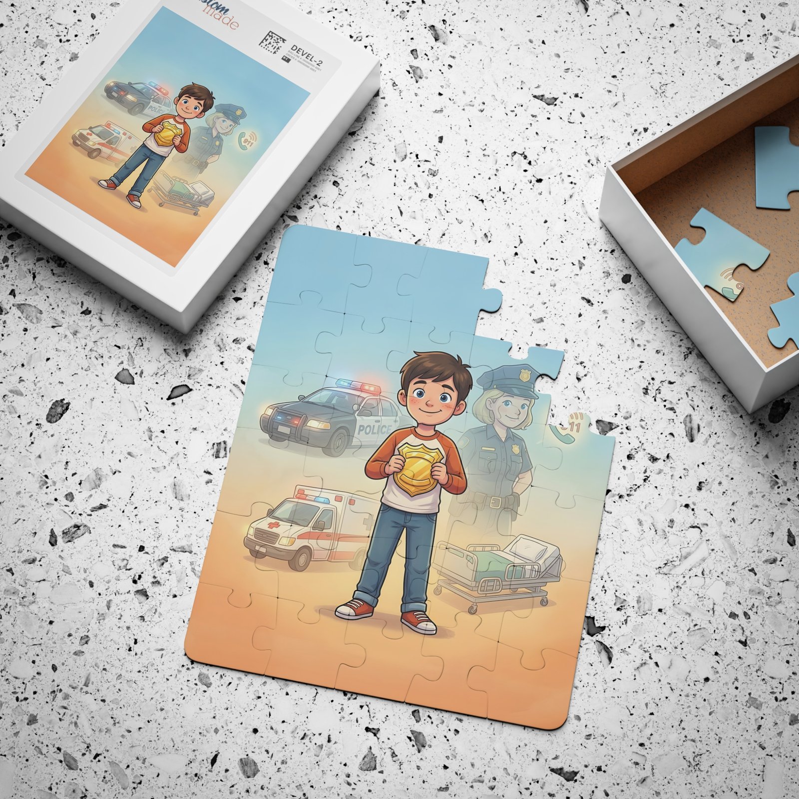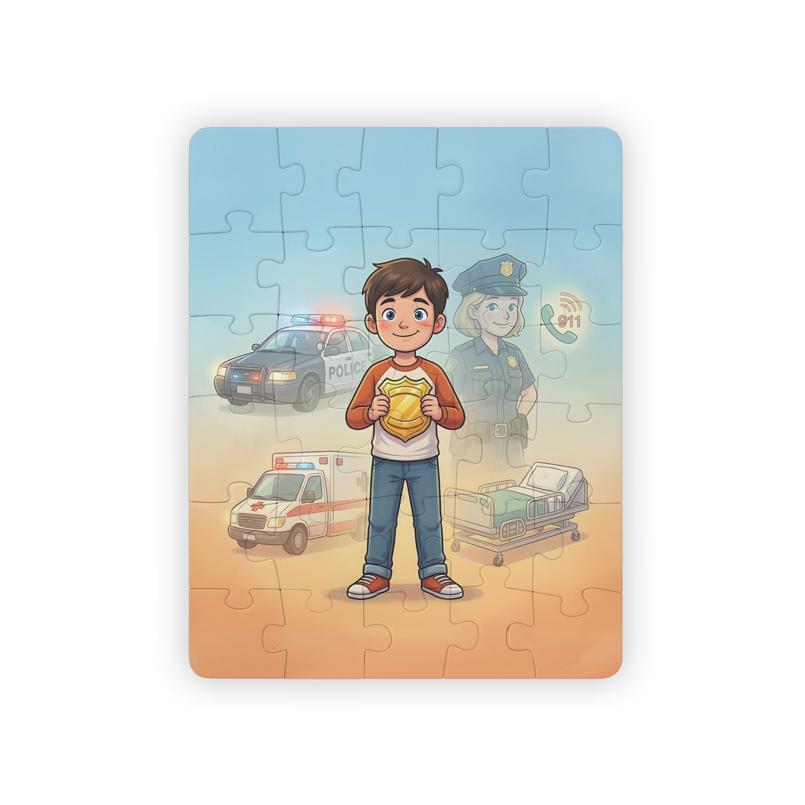 A bright, kid-friendly 30-piece puzzle that turns quiet moments into playful learning. The scene shows a smiling child holding a golden badge, with friendly emergency vehicles and a caring officer softly illustrated in the background. Each large, rounded chipboard piece fits easily in small hands and snaps together with satisfying stability. The laminated finish keeps colors vivid through repeated play and makes cleanup simple. Packaged in a box that displays the full image, the puzzle becomes a confidence-building activity for early puzzlers and a cozy, imaginative break in busy days.