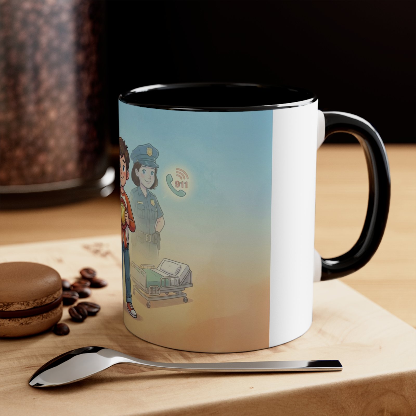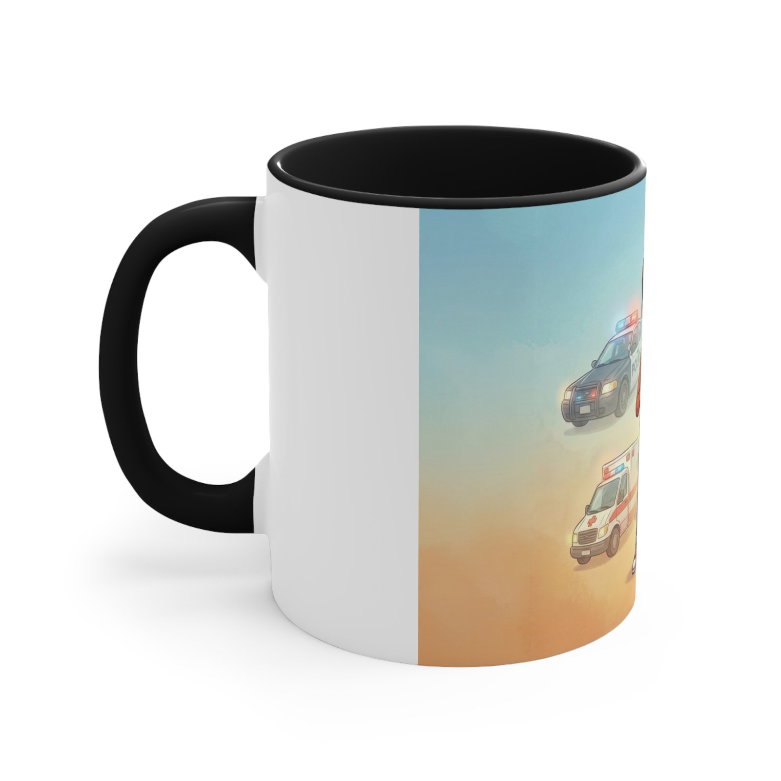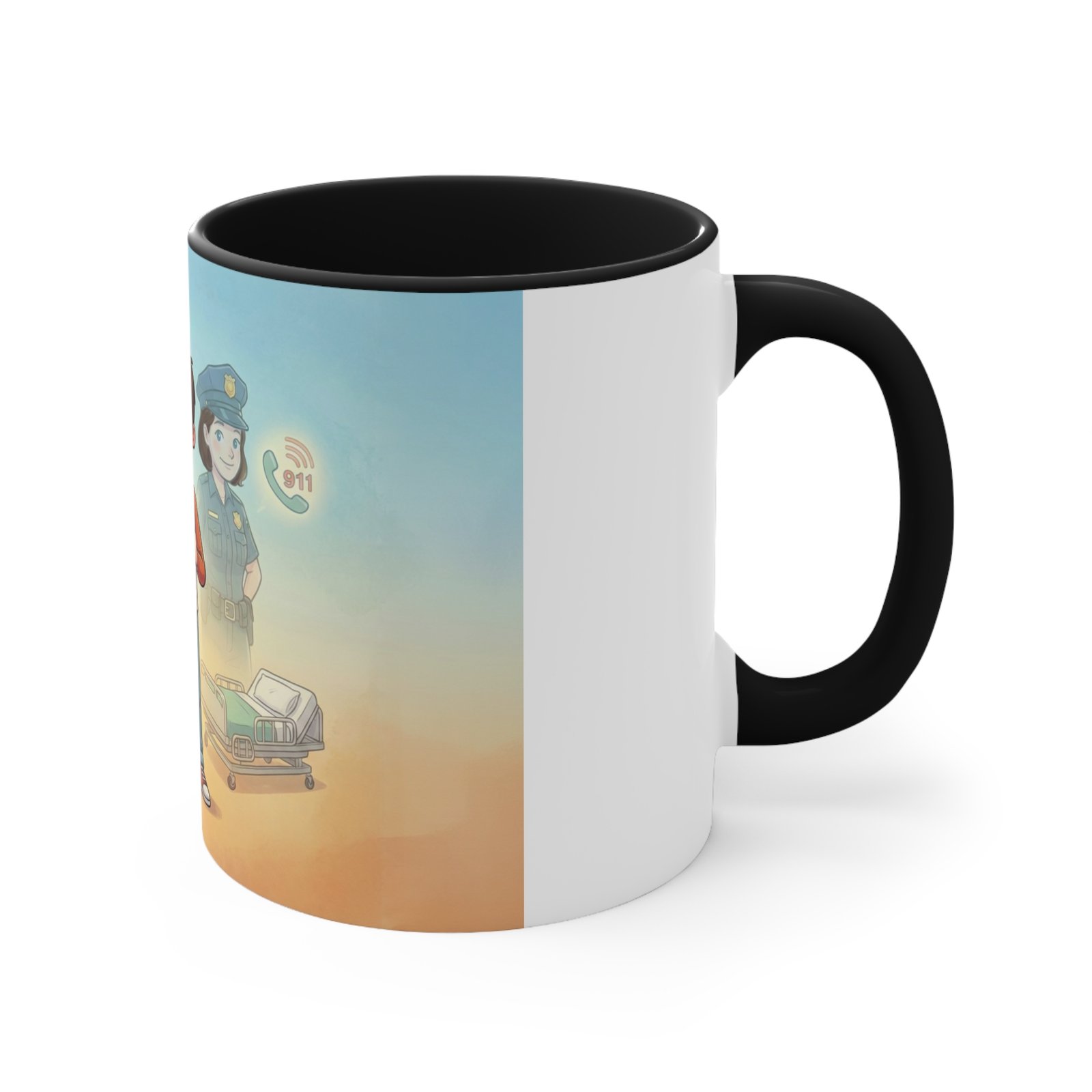 This ceramic accent mug brings a warm, hopeful scene to every morning. A smiling child stands front and center, proudly holding a ribbon, with soft, pastel illustrations of a police car, ambulance, and uniformed officer fading into the background. The colored interior and handle add a gentle pop of pink that complements the sunrise palette. Holding this mug feels like a small, quiet celebration of courage and community — a comforting companion while you sip coffee, tea, or cocoa and reflect on the everyday heroes around us.